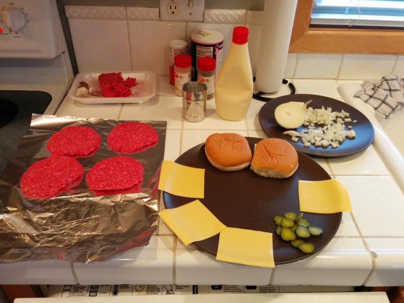 I first hand formed the patties into 1/6th pounders, diced up the onions, set the cheese slices and pickles aside. Then started the stove on medium.