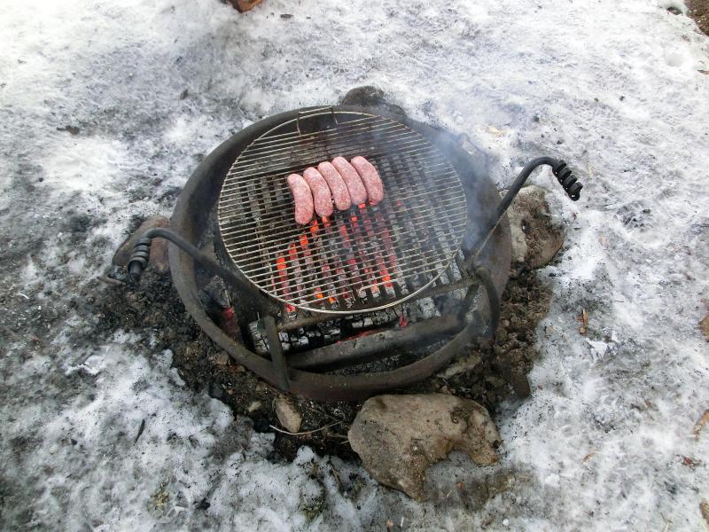 Getting back into camp was nice. We started another fire to do some coal cooking and stuck up a wind barrier tarp to help keep warm. Our bratwursts cooked over the coals tasted great.