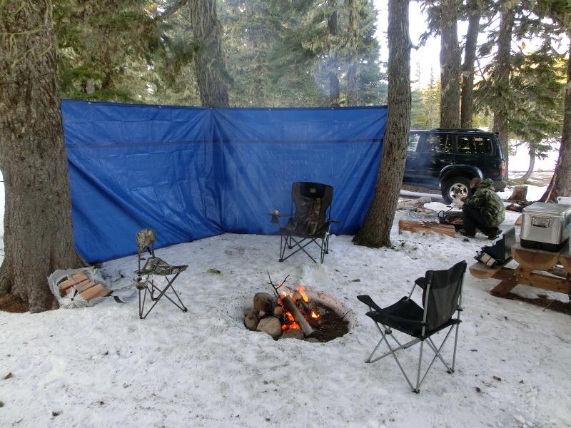 My 2nd snow camping trip of the season, Jason, Matt and I headed up to Bonnie Meadows. Its located a couple miles NW of Boulder Lake on the south side of Mt. Hood. We ended up getting to camp a little later in the day, maybe 2pm-ish. We found a nice camping spot at the south side of the campground located right off the meadow. Which we used to setup the carport in. As we were unpacking gear and getting the fire going, we had a huge gust of wind that took our 100+lb carport with a 10ft x 20ft footprint and toppled it end over end. After that, we achored it down into the snow.